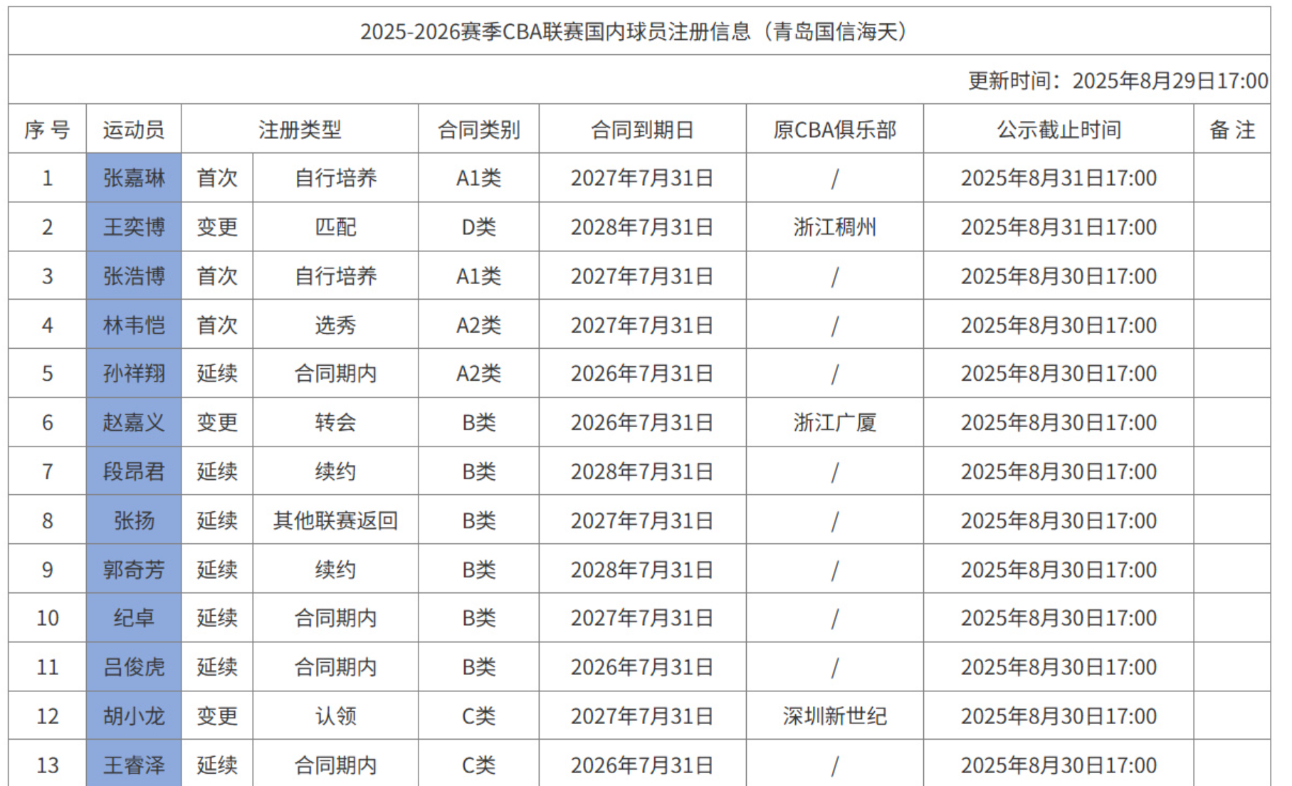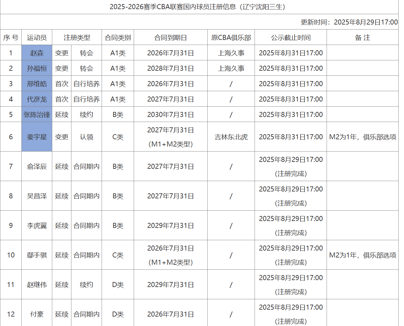 2025年8月29日继续更新注册名单,这期间焦点还是比较多的。其中徐昕只是租借到广州,这是让人意外的举动了。当然之前双方达成了回购条款,可能也是因为这个条款,所以显示是租借。按照之前公布的动态,广东可以在第二年和第三年回购,第四年就属于广州的了。