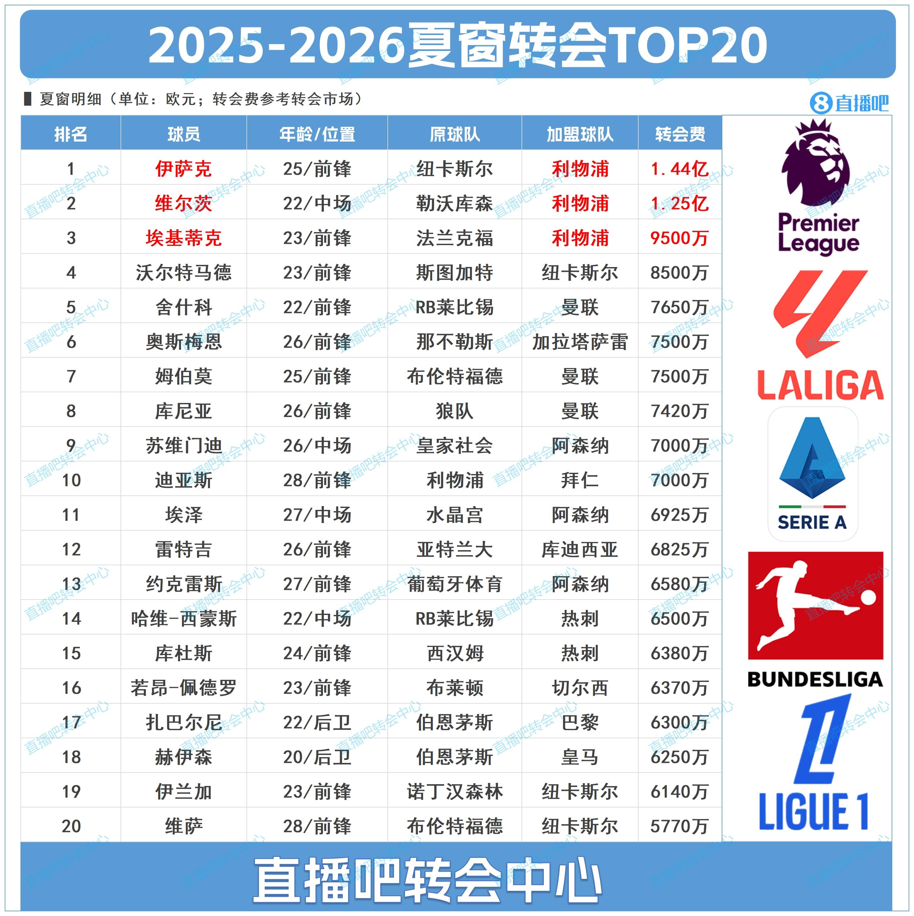 开云体育官方网站-夏窗TOP20转会:伊萨克1.44亿欧标王!利物浦包揽前三&两刷纪录