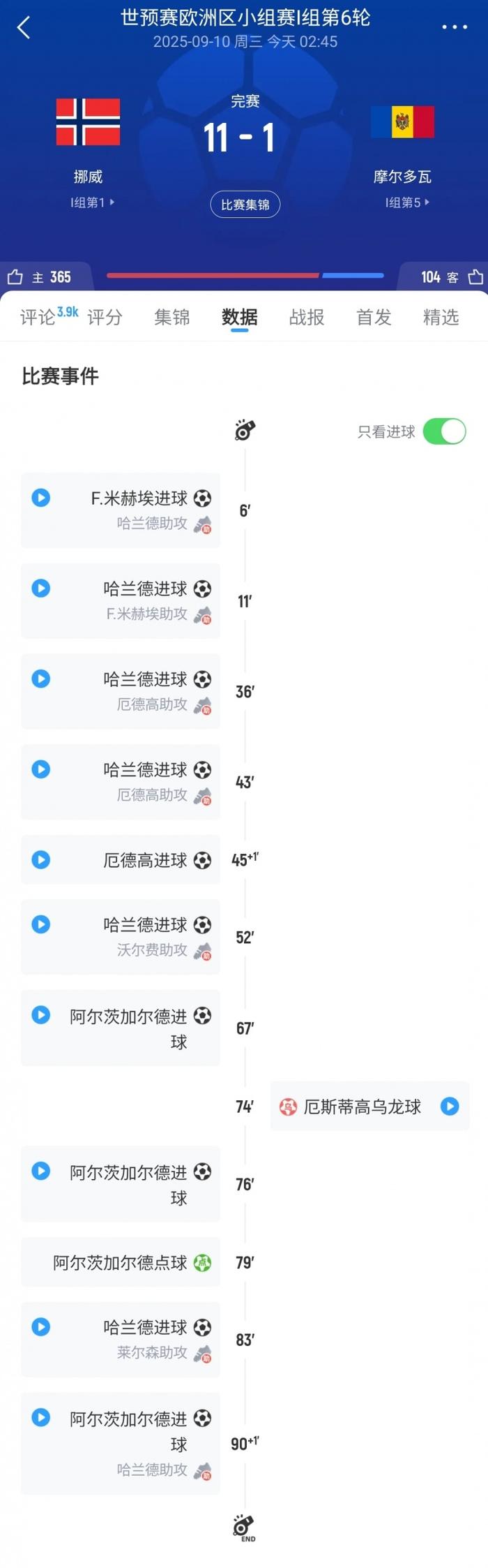 直播吧09月10日讯 世预赛欧洲区I组,挪威11-1狂胜摩尔多瓦,挪威球员包办12粒进球,其中包含了一粒乌龙球。